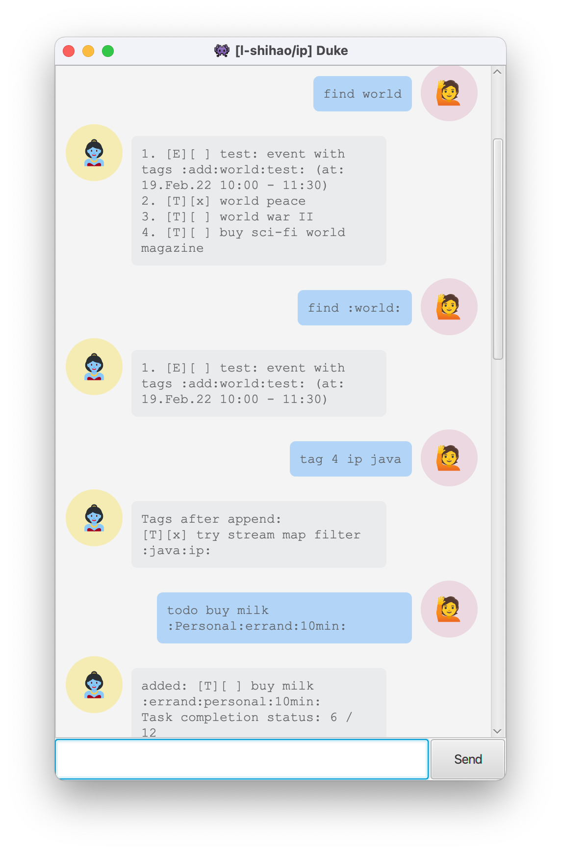 Duke is a desktop app for managing your daily tasks with a beautiful chatbot graphical user interface (GUI) and command line interface (CLI) like command input.